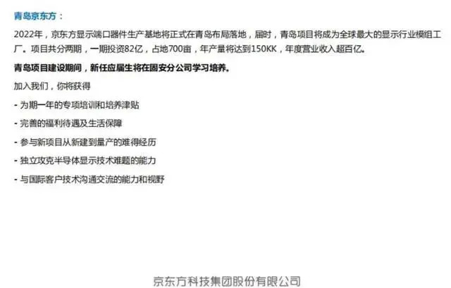 京东方招聘信息显示:“2022年京东方显示端口器件生产基地,将正式在青岛布局落地,届时,青岛项目将成为全球最大的显示行业模组工厂。该项目将分两期,一期投资82亿,年产量达150KK,年营业将超百亿。”