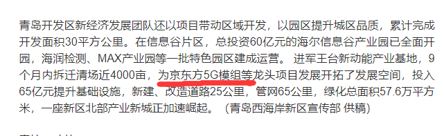2021年1月,青岛开发区一篇总结中表示,青岛开发区新经济发展团队进军王台新动能产业基地,9个月内拆迁清场近4000亩,为京东方5G模组等龙头项目发展开拓了发展空间。