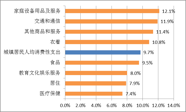 故事的开端是消费支出结构的变化。当人均收入达到8000-9000国际元以后,家庭消费支出结构会发生颠覆性变化。此前,温饱是家庭要解决的首要问题,所以家用支出中增速最快的是食品类支出。随着食品支出逐渐饱和,2005年-2012年,中国家庭消费支出中增速最快的品类是家用电器、交通通讯和服饰品类,而食品、教育娱乐、居住消费、医疗保健等增速较慢(图1)。