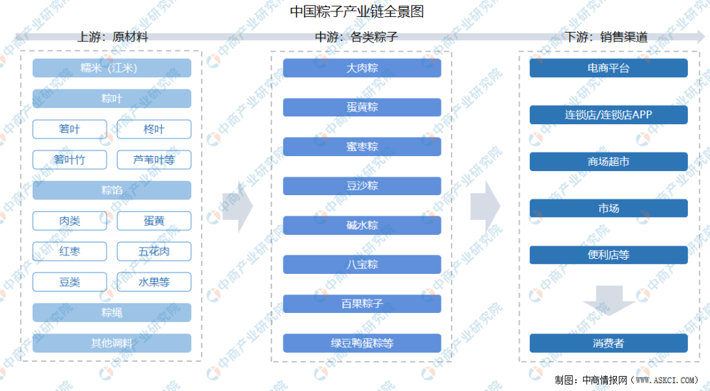 我国粽子产业链上游为原材料,主要包括糯米(江米)、粽叶、粽馅、粽绳等;中游为各式各样的粽子,常见的粽子有红枣粽子、肉粽、蛋黄粽等;下游是粽子的销售渠道,最后到达消费者。
