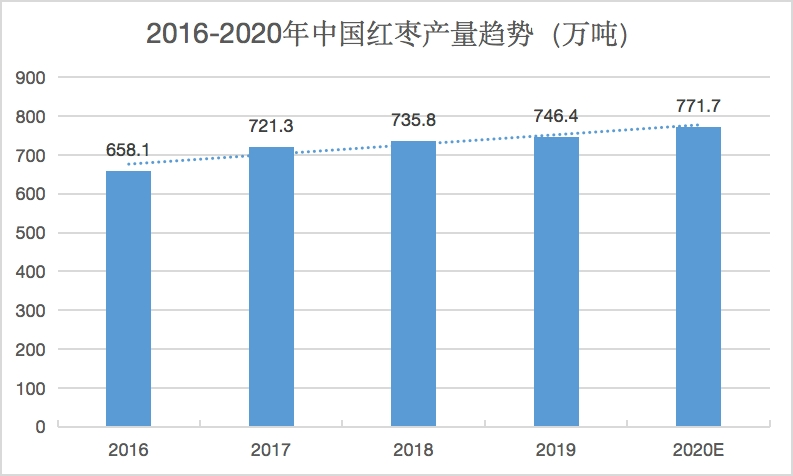 作为北方枣泥粽子重要原材料的大枣也在逐年攀升。数据显示,我国红枣产量由2016年685.1万吨增至2019年746.4万吨。预计到2021年我国红枣产量可达791.6万吨。