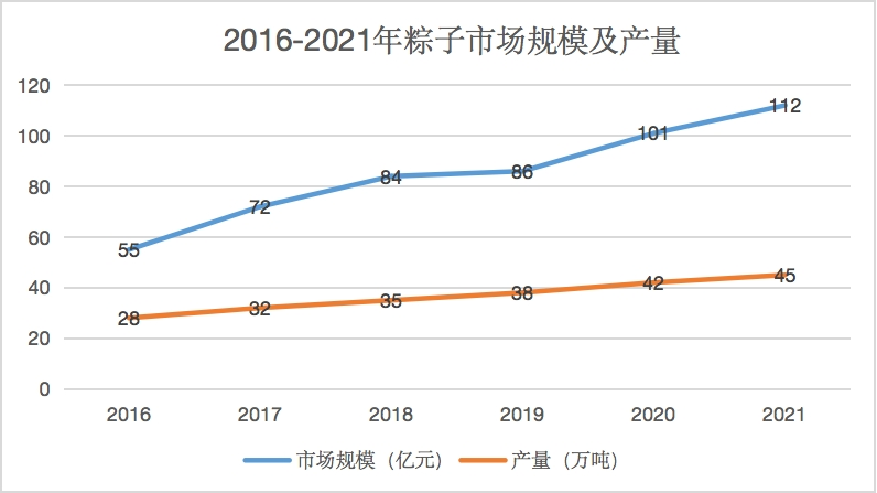 与此同时,粽子产业的中游市场也在逐步的扩大。近年来,粽子的消费量增大,市场规模和产量也不断加大。数据显示,我国粽子市场消费由2016年的55亿元增加到2020年的101亿元。预计到2021年规模可达到112亿元。
