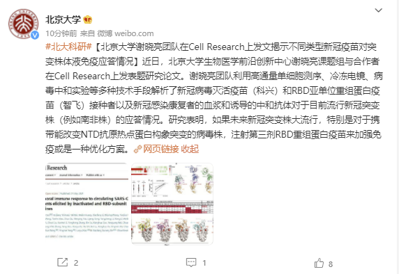 @北京大学 微博6月14日消息,近日,北京大学生物医学前沿创新中心谢晓亮课题组与合作者在Cell Research上发表题研究论文。研究表明,如果未来新冠突变株大流行,特别是对于携带能改变NTD抗原热点蛋白构象突变的病毒株,注射第三剂RBD重组蛋白疫苗来加强免疫或是一种优化方案。