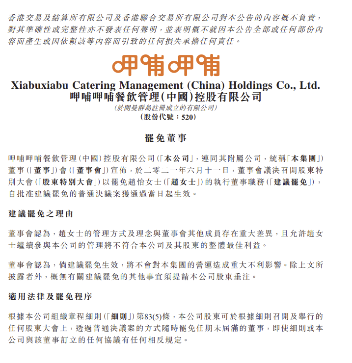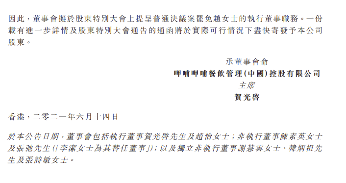呷哺呷哺在港交所公告,董事会决定罢免赵怡的执行董事职务,因其管理方式和理念与“董事会其他成员存在重大差异”。董事会认为,允许赵怡继续参与公司管理将不符合公司及其股东的整体最佳利益。董事会拟在股东特别大会上提出罢免赵怡的执行董事职务的普通决议案,详情将发送给股东。董事会认为此事不会对集团的营运造成重大不利影响。