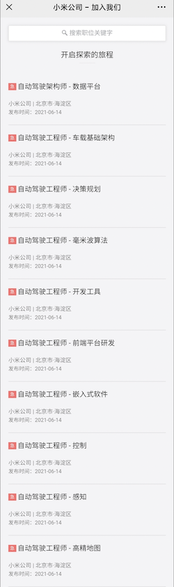 6月14日,小米公司的官网开始陆续冒出关于自动驾驶的各类职位。