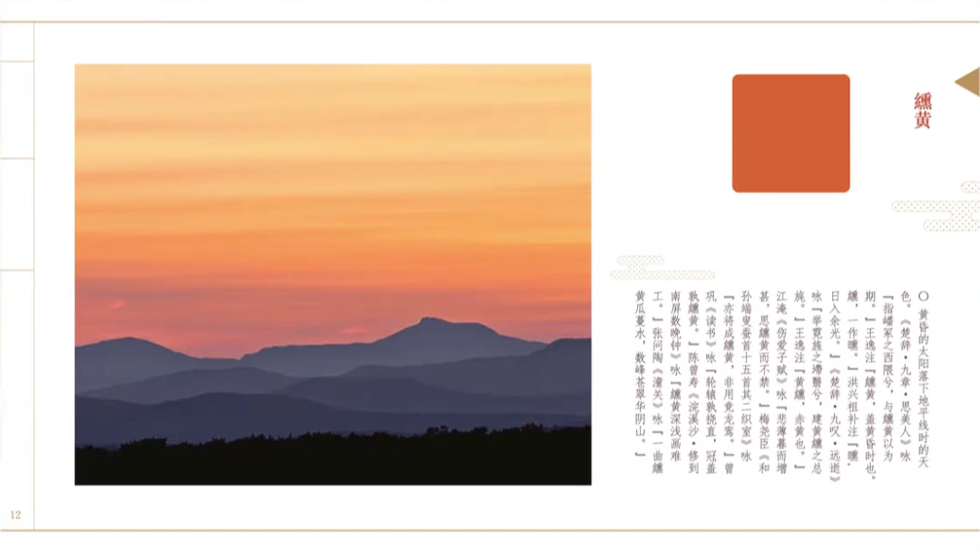 前面说了,“玄”是太阳在冒出地平线之前的颜色,“纁”就恰好相反,它是一天结束后太阳落到地平线的下面所折射出来的余光,不是纯粹的黄或红,而是红和黄的一种交织。