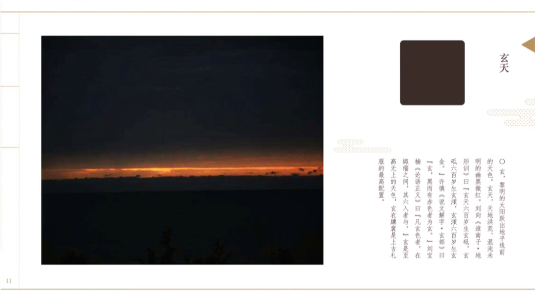影视剧中经常提到的“玄色”也是黑的一种,不过它更偏向于带赤的黑,地平线在太阳将出未出的时候,天空呈现的那种黑中透红的颜色。