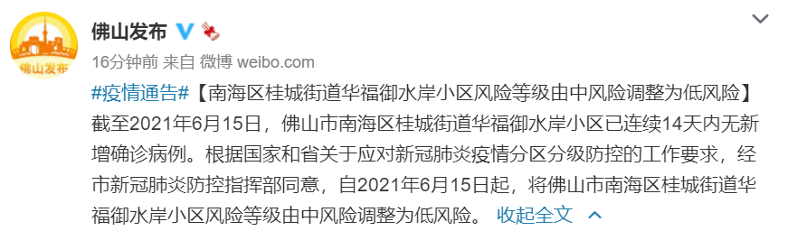 据@佛山发布 微博消息,截至2021年6月15日,佛山市南海区桂城街道华福御水岸小区已连续14天内无新增确诊病例。根据国家和省关于应对新冠肺炎疫情分区分级防控的工作要求,经市新冠肺炎防控指挥部同意,自2021年6月15日起,将佛山市南海区桂城街道华福御水岸小区风险等级由中风险调整为低风险。
