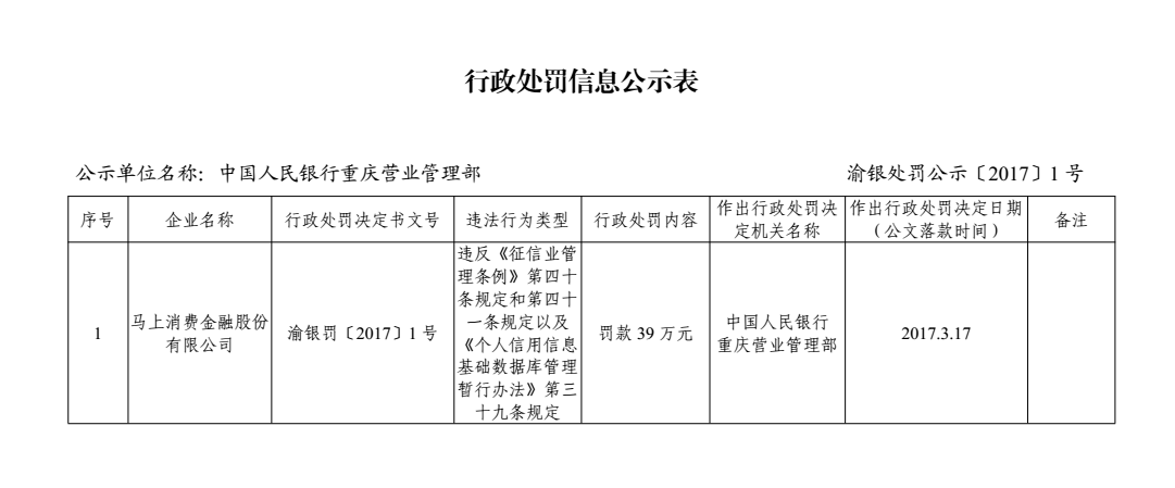 2017年,马上消金就曾因风控环节疏漏遭人民银行重庆营业管理部开出罚单。文号为渝银罚〔2017〕1 号的行政处罚书显示,马上消金因违反征信相关条款,被罚款39万元。