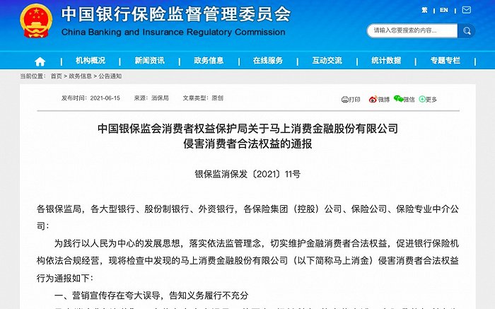6月15日,中国银保监会消费者权益保护局发布《关于马上消费金融股份有限公司侵害消费者合法权益的通报》,列举了马上消费金融(以下简称“马上消金“)涉及营销宣传、定价管理、学生贷款、第三方管控、催收管理、联合贷款管理、消保体制机制等七个方面的违规行为。