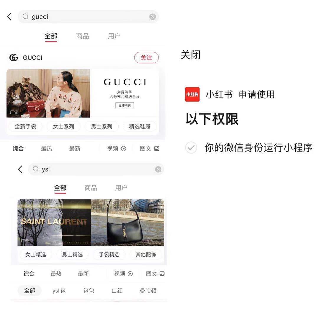 近日,界面新闻发现,在小红书搜索“LV”、“GUCCI”、“CELINE”等品牌之后,其企业号页面均显示了“广告”标识的链接,点击之后可跳转至微信小程序。