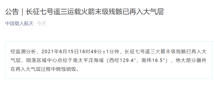 据中国载人航天工程办公室消息,经监测分析,6月15日16时49分±1分钟,长征七号遥三火箭末级残骸已再入大气层,陨落区域中心点位于南太平洋海域(西经129.4°,南纬16.5°),绝大部分器件在再入大气层过程中烧蚀销毁。