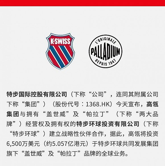 6月15日,特步国际发布公告称,将与高瓴资本建立战略合作关系,后者将对特步环球旗下“盖世威”及“帕拉丁”品牌的全球业务进行6500万美元(约5.06亿港元)投资。此外高瓴还就特步发行的可换股债权订立认购协议,投资本金总额为5亿港元。