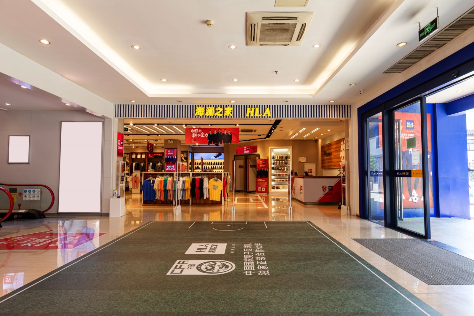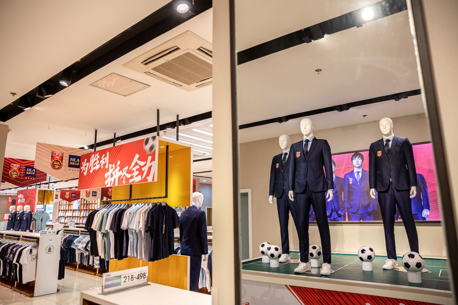 有趣的是,为了这次合作,海澜之家还专门在苏州改造了一家足球主题店。与以往简单的门店装饰不同,这间足球主题店内摆设上了大量红白双色的横幅,凸显出足球作为竞技运动的热情感,并内置了一块迷你绿茵球场,提供沉浸式的体验氛围。