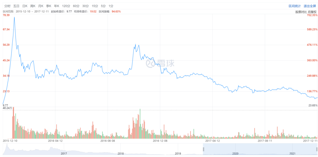 刚刚登陆资本市场时,读者传媒无疑足够闪耀。从2015年12月10日上市首日,至2016年1月6日,不足一个月的时间,其收获了19个涨停板,股价也于2016年1月7日达到78.5元的峰值(后复权),市值近200亿元。