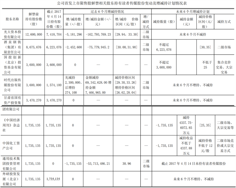 而根据2017年4月读者传媒回复上交所问询函披露的信息,2016年-2017年4月已解除限售的9个发起股东中,4个已不同程度通过二级市场减持了股份。其中酒钢集团套现7580万;时代传媒套现6900万;通用投资则清空了所有股份,套现5370万。还有4个股东都有未来6个月减持公司股份的计划。