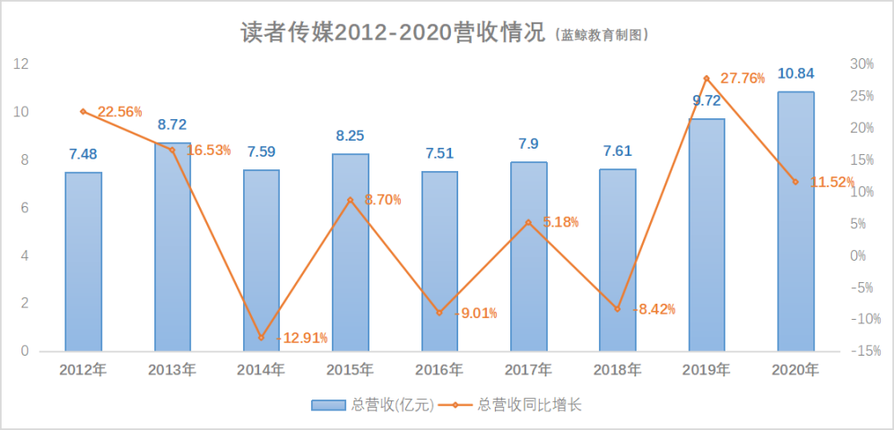 据招股书信息显示,2012、2013、2014年,读者传媒的营收分别为7.48亿元、8.72亿元、7.59亿元。2015年度,读者传媒营收8.25亿元,比2013年减少了5.39%。