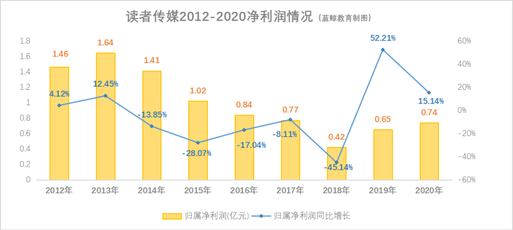 从营收数据上来看,2019、2020年出现了明显增长。2019年,读者传媒实现营收9.72亿元,直接跨越8亿元门槛;2020年其营收突破10亿,达到10.84亿元。利润也随之回归增长,2019年,读者传媒实现净利润0.65亿元,同比增长52.21%;2020年增至0.74亿元,同比增长15.14%。