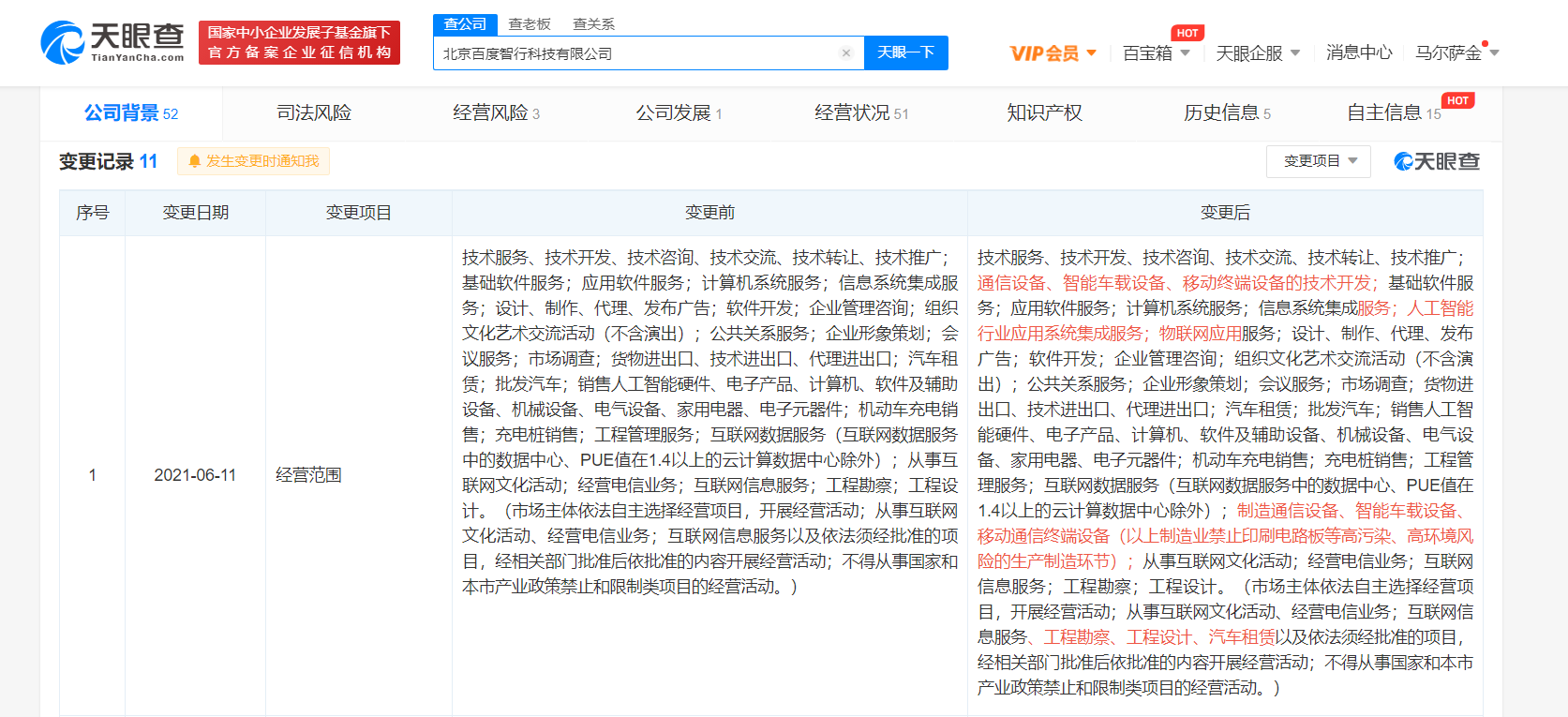 据天眼查APP显示,6月11日,北京百度智行科技有限公司发生工商变更,经营范围新增“制造通信设备、智能车载设备、移动通信终端设备”等。