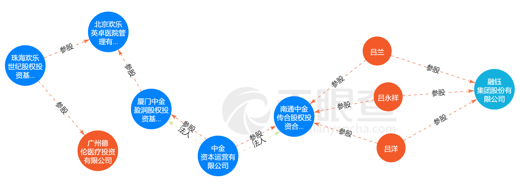 天眼查显示,德伦医疗有股东名为珠海欢乐世纪股权投资基金(有限合伙)。珠海欢乐世纪股权投资基金(有限合伙)同时也参股了北京欢乐英卓医院管理有限公司。从股权结构看,北京欢乐英卓医院管理有限公司与中金资本运营有限公司有一定关联,而中金资本运营有限公司参股的南通中金传合股权投资合伙企业(有限合伙),同时也被自然人吕永祥、吕兰、吕洋参股。这个吕永祥便是融钰集团的原控股股东,吕洋、吕兰为吕永祥子女。