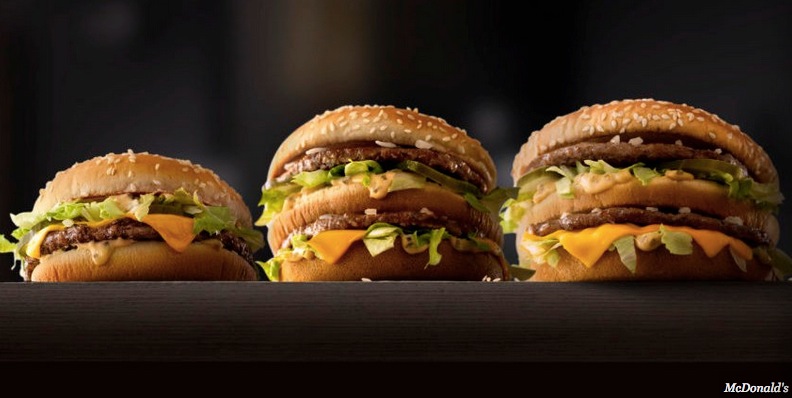 麦当劳最近围绕其代表性菜品——巨无霸进行了改变,推出了不同尺寸的巨无霸产品,除了常规版的巨无霸(Big Mac),还有一个大一号的Grand Mac和一个小一号的Mac Jr。