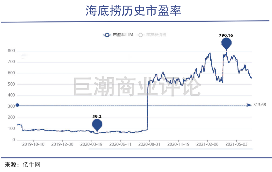 相比股价,海底捞超高的估值更加引人注意——疫情之后企业业绩亏损,但股价被推上了更高的高度,市盈率随之陡升,长期保持在数百倍的夸张位置。