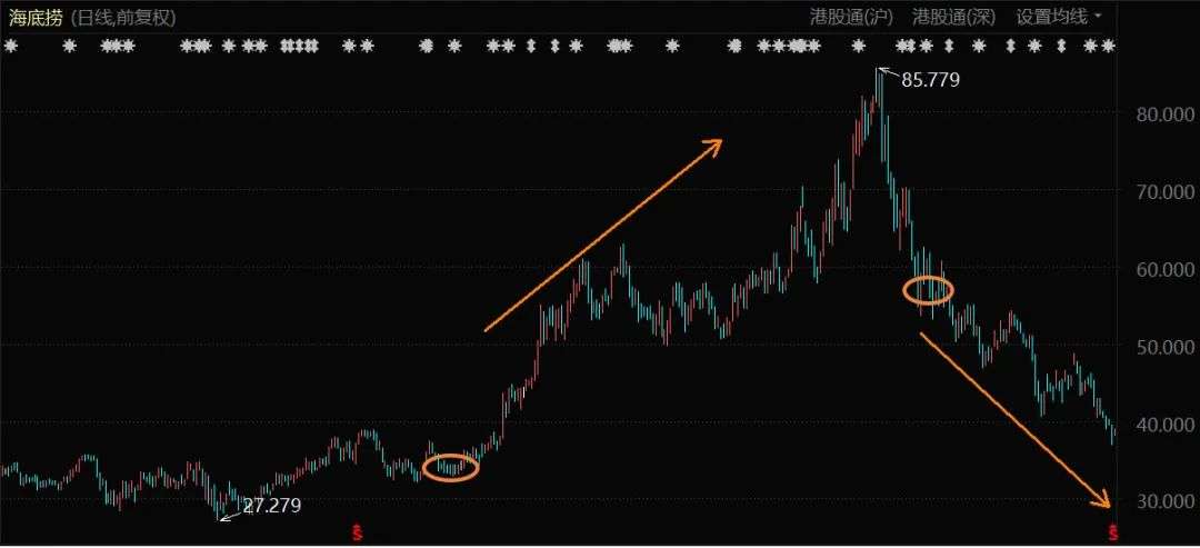 3月,海底捞发布了盈利预警,2020年年报净利润相比2019年下降90%,也就是整体的净利润仅为约2.35亿元,海底捞股价从那时起就开始不断下挫。