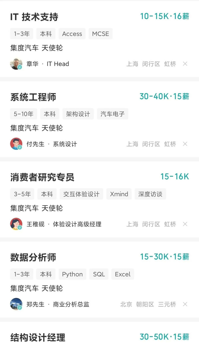 具体到挖人薪酬上,连线出行通过第三方招聘平台看到,集度汽车对于IT技术支持和数据分析师等岗位均给出了10-15K的薪资,系统工程师岗位薪资甚至达到了30-40K,以上岗位均是15-16薪。