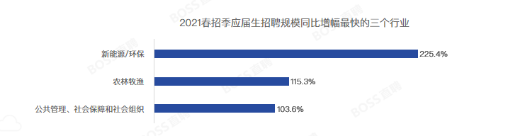 值得一提的是,BOSS直聘发现,尽管互联网、金融等行业仍是传统的“岗位大户”,但在新能源汽车、智能驾驶、碳中和、乡村振兴、智慧农业等一系列产业和政策热点的助推下,新能源/环保、农林牧渔、社区管理等“冷门领域”对高学历青年人才十分渴求,招聘规模迎来高峰,普遍呈现翻倍增长。