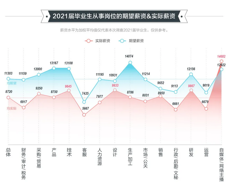 从岗位情况来看,传统职业中,设计、研发、技术岗税前薪资排名前三,分别为9933元、9867元、9845元;作为新兴职业,自媒体/网络主播税前薪资最高,为14682元,超出了毕业生对该岗位的期望薪资。整体来看,技术含量高的岗位薪资普遍较高,而随着直播、短视频的蓬勃发展,新兴职业待遇“水涨船高”。