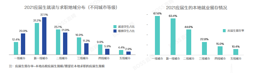 BOSS直聘研究院数据显示,2021年,一线和新一线城市高校的毕业生,希望在就读城市发展的比例均超过60%;而三、四、五线城市培养的高校毕业生愿意留在本市发展的比例普遍不高,城市的高学历适应岗位规模和人才吸引力明显不足。