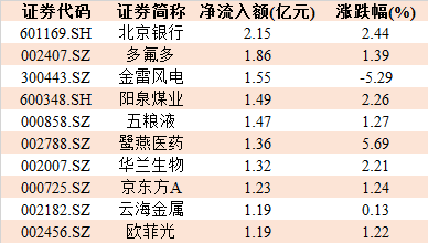 北京银行(601169.SH)、多氟多(002407.SZ)、金雷风电(300443.SZ)的净流入资金额居两市前三位,分别为2.15亿元、1.86亿元、1.55亿元。25日当日,共计13只个股净流入资金额跻身“亿元俱乐部”,还包括阳泉煤业(600348.SH)、五粮液(000858.SZ)、鹭燕医药(002788.SZ)等。而当天,主力资金则重点抢筹招商银行(600036.SH)、赛福天(603028.SH)、中国太保(601601.SH)等个股,其主力净流入额分别为1.68亿元、1.63亿元、1.58亿元。