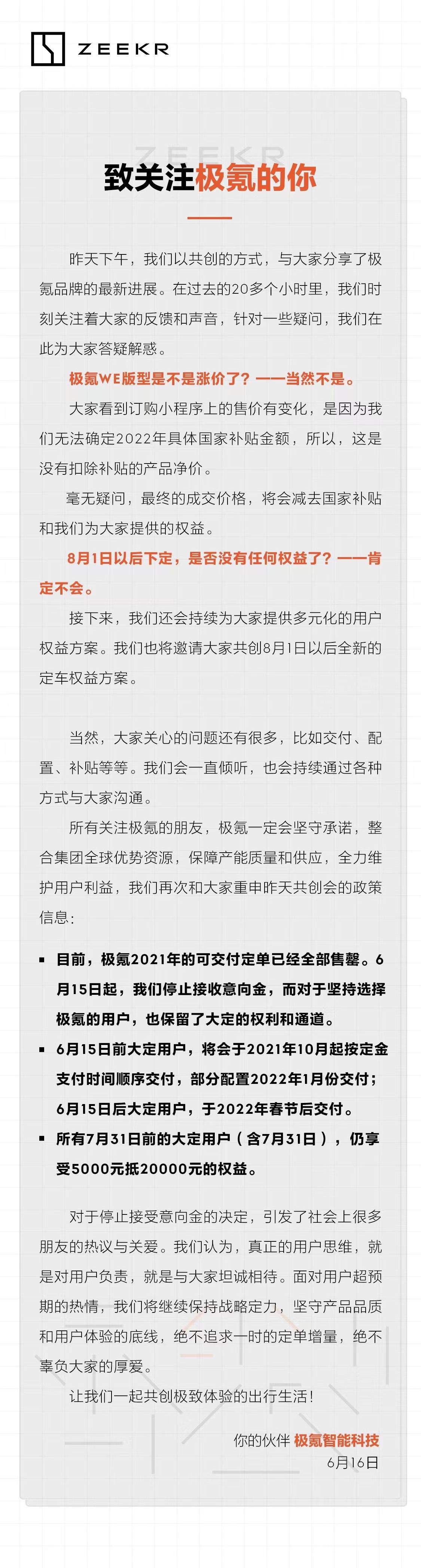 -6 月 15 日起,停止接收小定意向金(2000元、可退),而对于仍然想选择极氪的用户,也保留了大定(5000元、不可退)的权利和通道;
