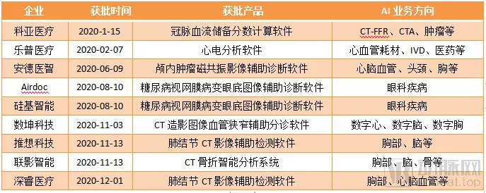 2020年1月,科亚医疗的CT-FFR产品“深脉分数”率先打破了审评审批的桎梏,拿到第一张医疗AI医疗器械三类证,将工作重心由研发向价格目录开拓与市场销售偏移。2月,乐普医疗“AI-ECG Platform”获NMPA批准,心脏相关AI 再下一城。6月,更贴合“辅助诊断”定义的颅内肿瘤MR影像辅助诊断软件获批,安德医智异军突起。7月丰收的是Airdoc、硅基智能两家AI企业,这个月,NMPA一口气开出了两张“糖尿病视网膜病变眼底图像辅助诊断软件”注册证。