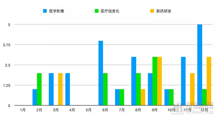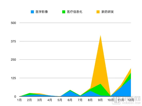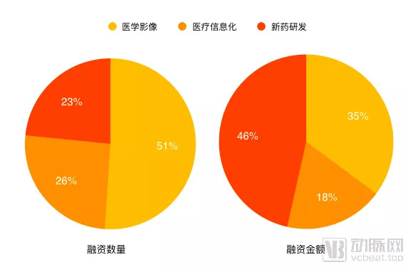 从融资列表中我们可以了解到,新药研发融资数量最少,但融得资金量最大,平均融资金额最高(3.58亿),占据了超过50%的融资总量;医疗影像融资项目最多,但项目平均融资金额最小(1.24亿),略低于医疗信息化赛道(1.30亿)。