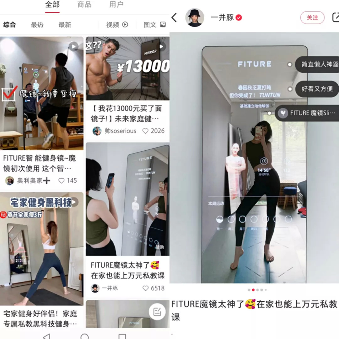 翻开小红书,搜索#健身#显示有260万笔记,比#美妆#的249万还要多出十万。无论男女,对好身材的追求都是相同的:八块腹肌、A4腰、马甲线、蜜桃臀……这些网热词换算成背后的标签,是美丽、健康以及自律。就像Lululemon贩卖生活方式,靠着线下社交卖爆了一条瑜伽裤一样,健身镜要破圈,也要找准那一批对运动有着向往和爱好的消费者。