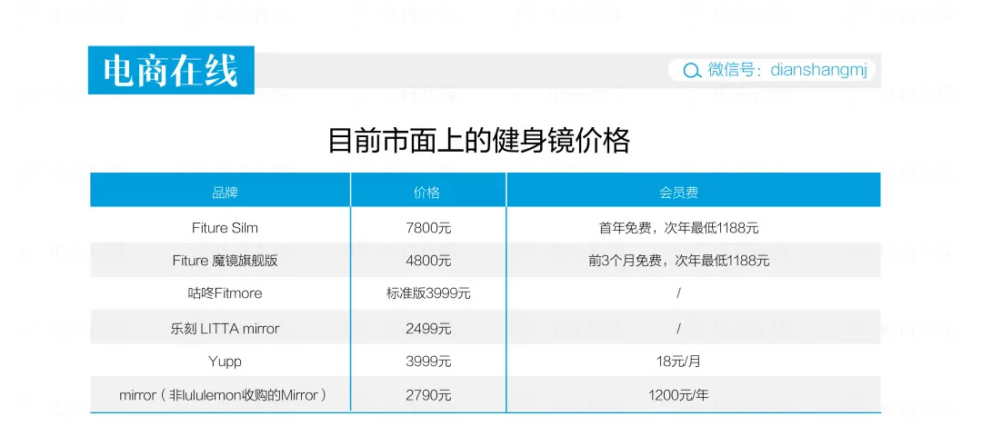 各家产品开发进度不同,动作最快、已经在量产的是FITURE、Fitmore以及Yupp,乐刻的镜子只能在乐刻APP购买,Keep的健身镜也在研发中,计划投入市场。价格带设置也不同,目前国内健身镜价格带有三种:2000元左右是第一档,3000-4000元左右是第二档,最高档就是7000-8000元左右。