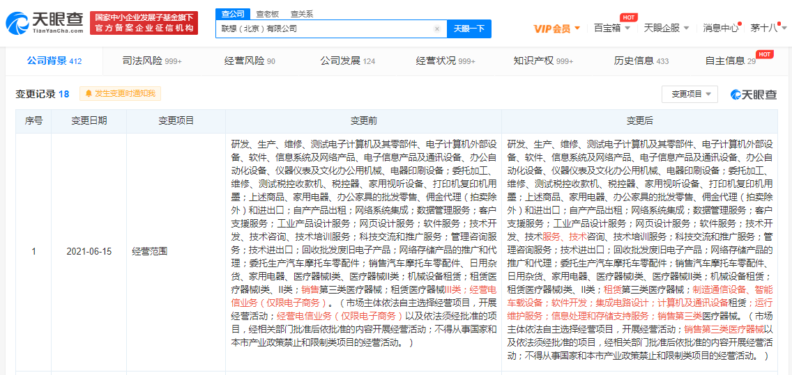 据天眼查APP显示,6月15日,联想(北京)有限公司发生工商变更,经营范围新增制造通信设备、智能车载设备;软件开发;集成电路设计等。