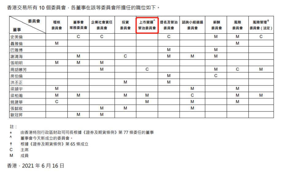6月17日消息,港交所昨日发布公告称,港交所新增了一个“上市营运管治委员会”,委员会内有三位成员,包括由特区政府委任的董事周胡慕芳担任主席,其他成员包括董事梁柏瀚、姚建华。