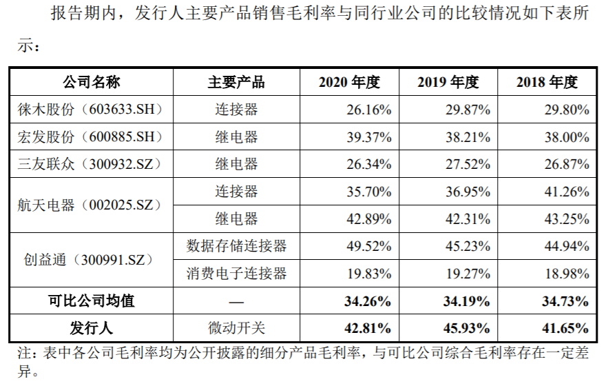 招股书显示,在同行业可比公司的选择上,东南电子称目前国内尚无与公司从事完全相同业务的上市公司。由于公司的微动开关产品属于电子元器件,其原材料、生产工艺、下游市场均与继电器、连接器相似,故选取继电器、连接器行业的上市公司作为可比公司。