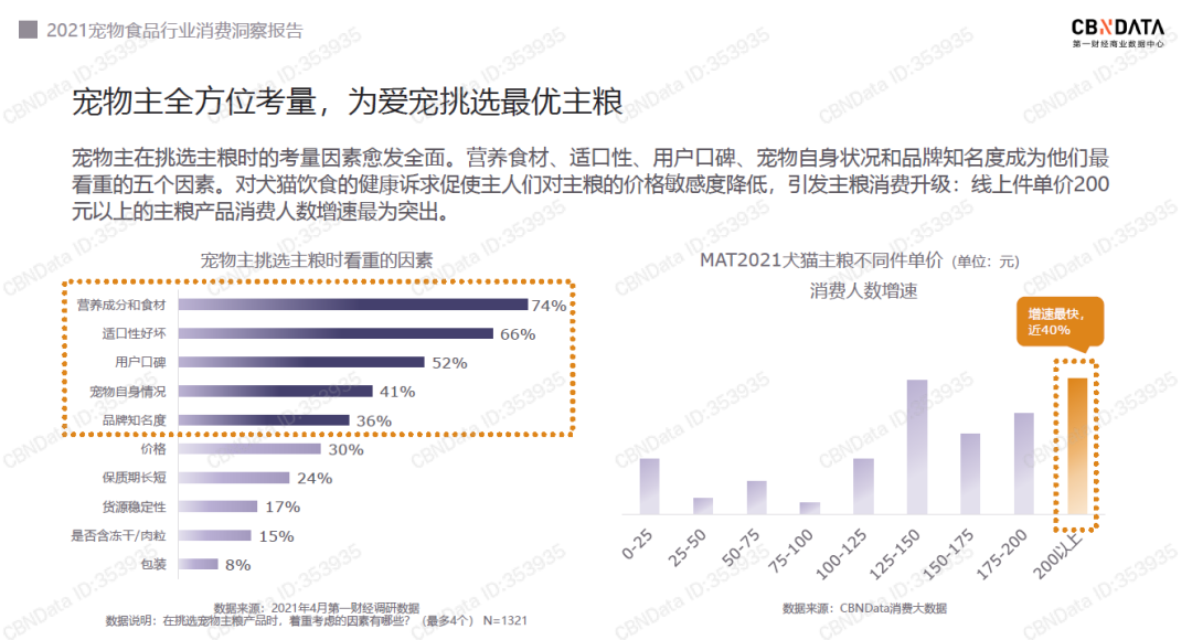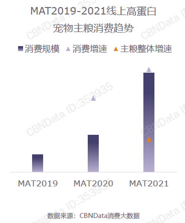 犬猫主人购买主粮时最关心的因素,都是蛋白质含量,线上高蛋白宠物主粮消费增速远超整体主粮。