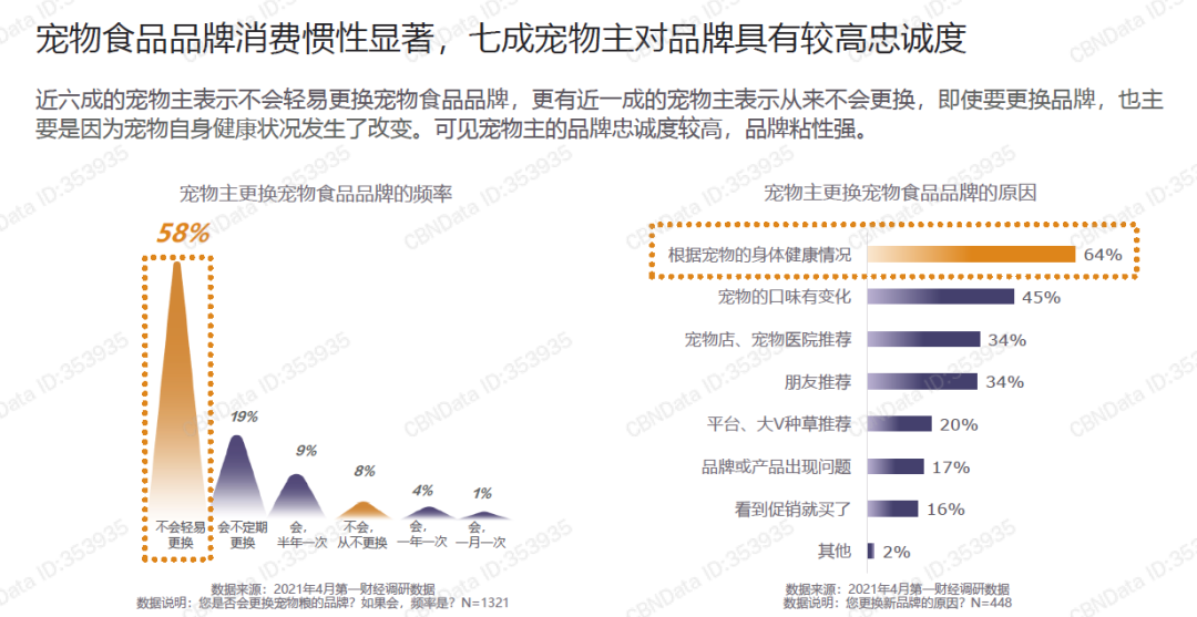 和“2020年白皮书”的调研结论不同,“洞察报告”的调研显示,宠物主对宠物食品的品牌忠诚度较高。58%的被调研者“不会轻易更换品牌”,8%的被调研者“从不更换品牌”。更换品牌的TOP3原因为:宠物健康状况变化、宠物口味变化、宠物店或宠物医生推荐。