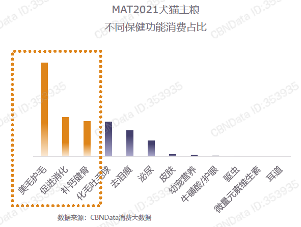 美毛护毛、促进消化、补钙健骨等元素向主粮渗透。具有护眼功能的产品在狗主粮中消费增速最快,专门针对幼猫的营养补充元素在猫主粮中消费增速最突出。