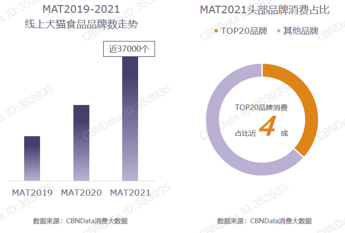 “洞察报告”显示,MAT2021(*2020.04.01-2021.03.31)线上犬猫食品品牌数近37000个,TOP20品牌的消费占比近四成。
