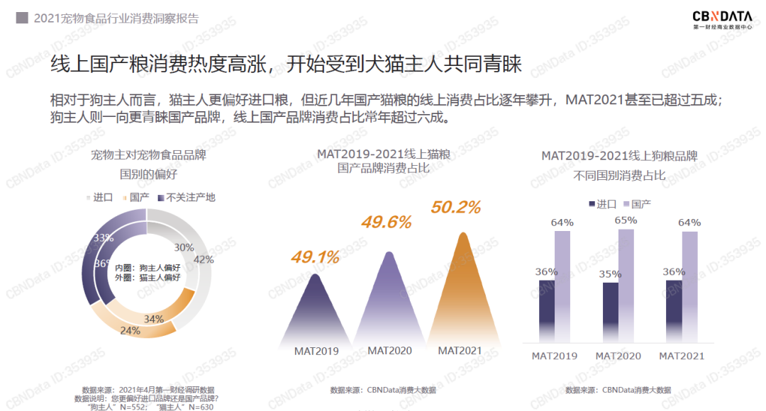 线上国产粮消费热度高涨。“洞察报告”显示,犬主人对国产品牌的偏好度已经超过进口品牌,猫主人对进口品牌的偏好度仍较高,但国产品牌消费占比也已经超过50%。