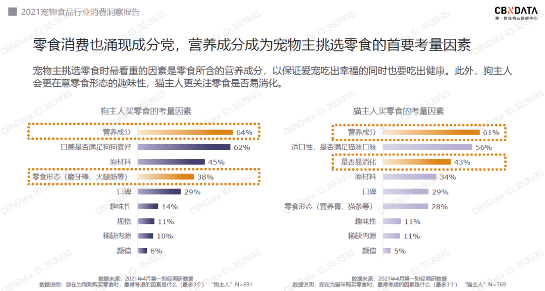 犬猫主人购买零食时的消费决策因素有所差异。在TOP5消费决策因素中,营养成分、适口性、原材料、口碑是犬猫主人共同关心。此外,犬主人更关注零食形态,而猫主人对是否易消化的关注度较高。这也和“2020年白皮书”的调研结论基本一致。