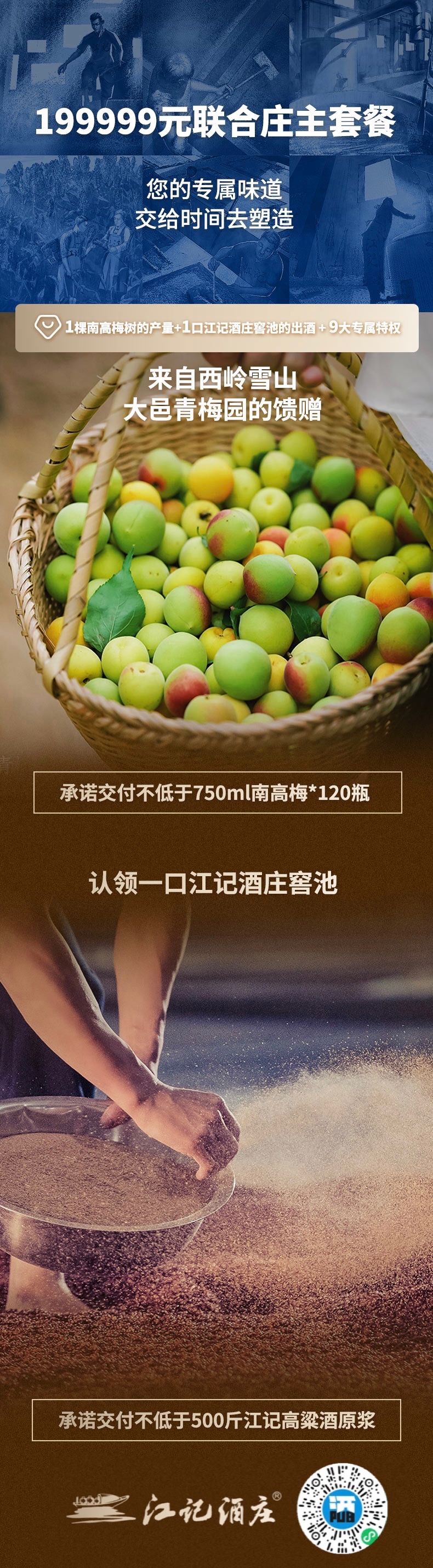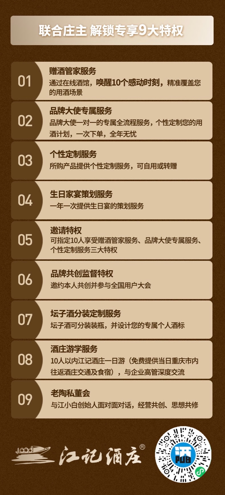 今年的“酒庄支持者计划”共分四个套餐,分别是:价值999元的“品牌体验官”、价值9999元的“品牌挚友”套餐、价值39999元的“品牌联合主理人”套餐和价值199999元的“联合庄主”套餐。所有套餐已在江记酒庄“我的酒馆Pub”微信小程序里上线,消费者可随时下单购买。