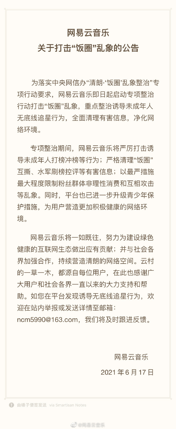 6月17日,@网易云音乐 微博发布公告称,为落实中央网信办“清朗·‘饭圈’乱象整治”专项行动要求,网易云音乐即日起启动专项整治行动打击“饭圈”乱象,重点整治诱导未成年人无底线追星行为,全面清理有害信息,净化网络环境。