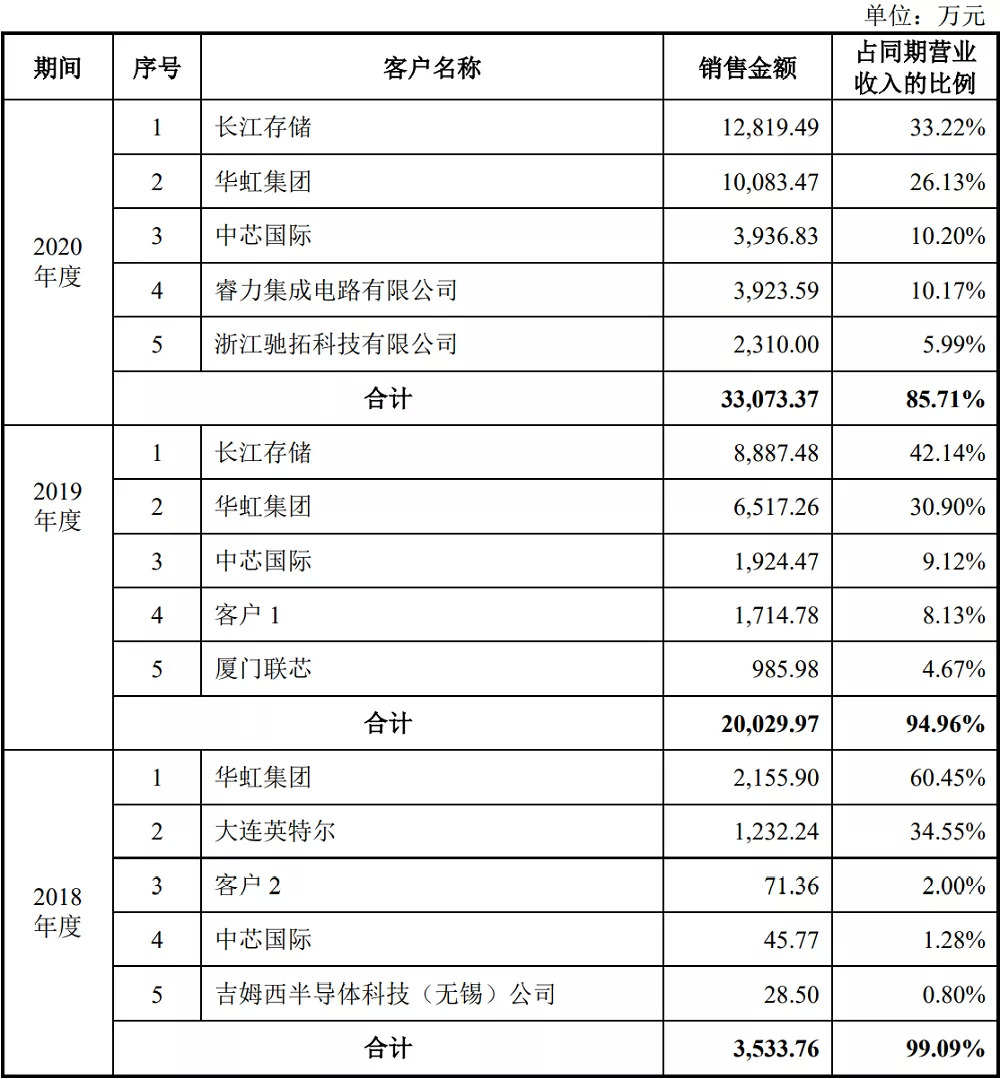 在客户方面,由于半导体行业技术密集和资本密集的特性,华海清科的客户相对较为集中。2018年、2019年、2020年,华海清科前五大客户占比分别为99.09%、94.96%和85.71%。