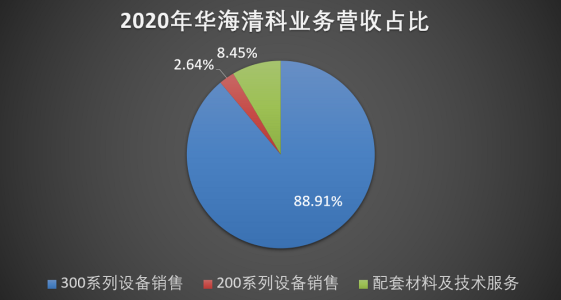 根据统计,300系列设备是华海清科的主营产品,2020年300系列设备销售金额占总营收比例分别为88.91%,200系列占比为2.64%,配套材料及技术服务占比则为8.45%;2018年-2020年,300系列设备的销售金额占华海清科营收占比分别为89.01%、92.39%和88.91%。